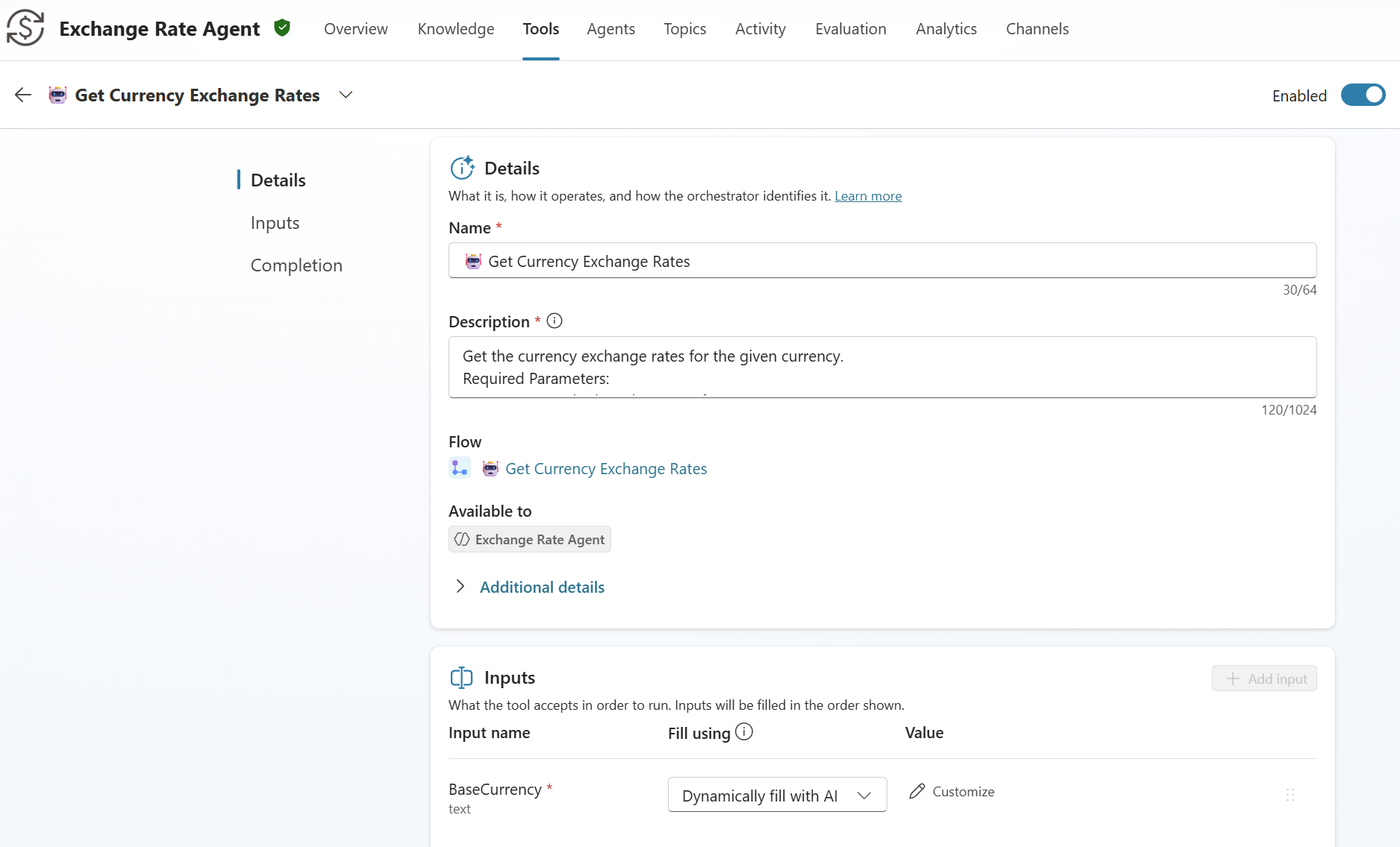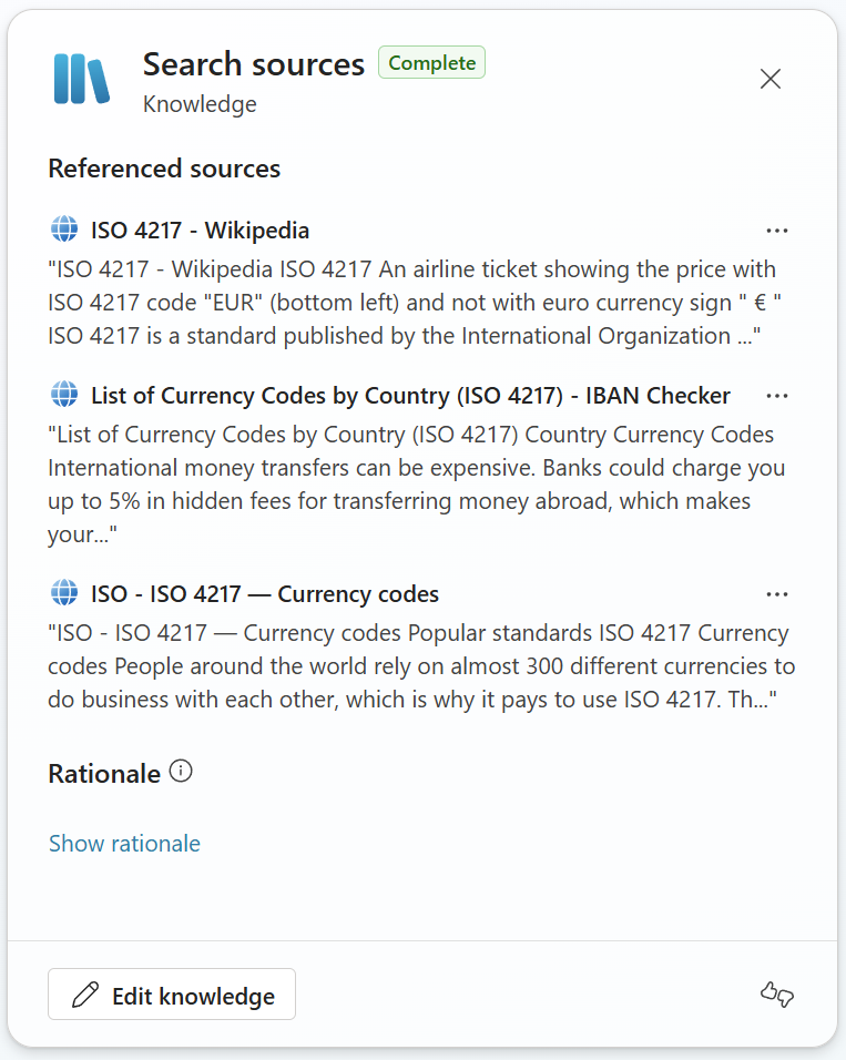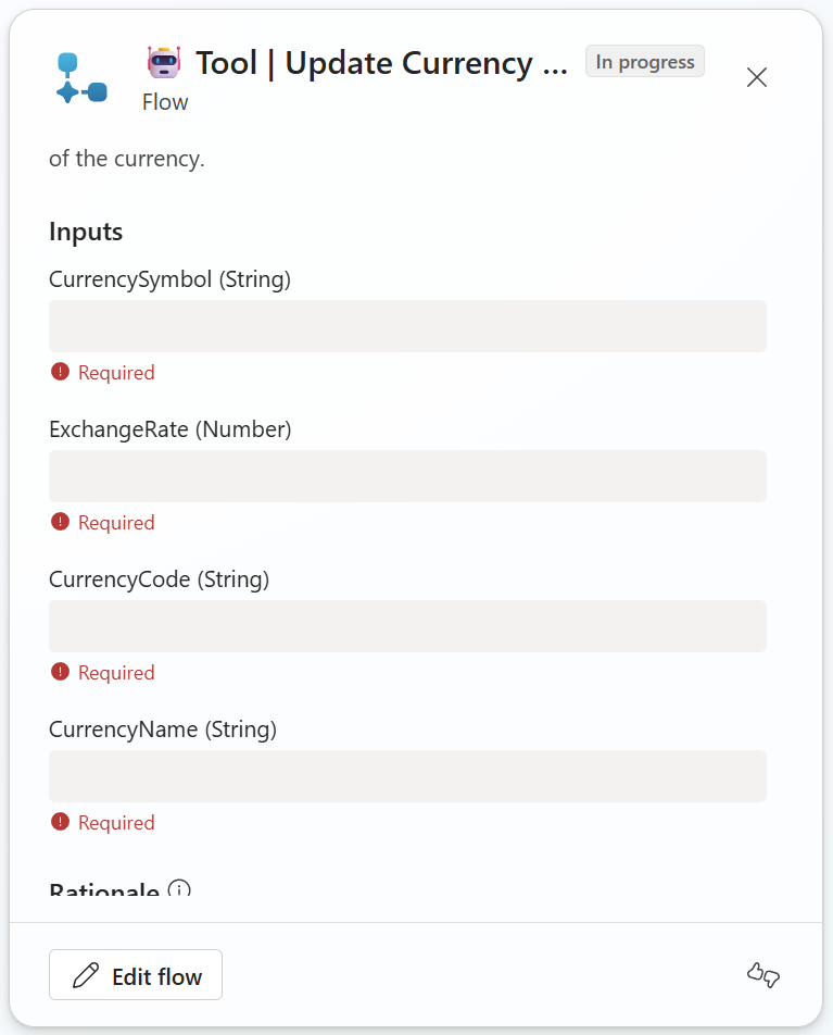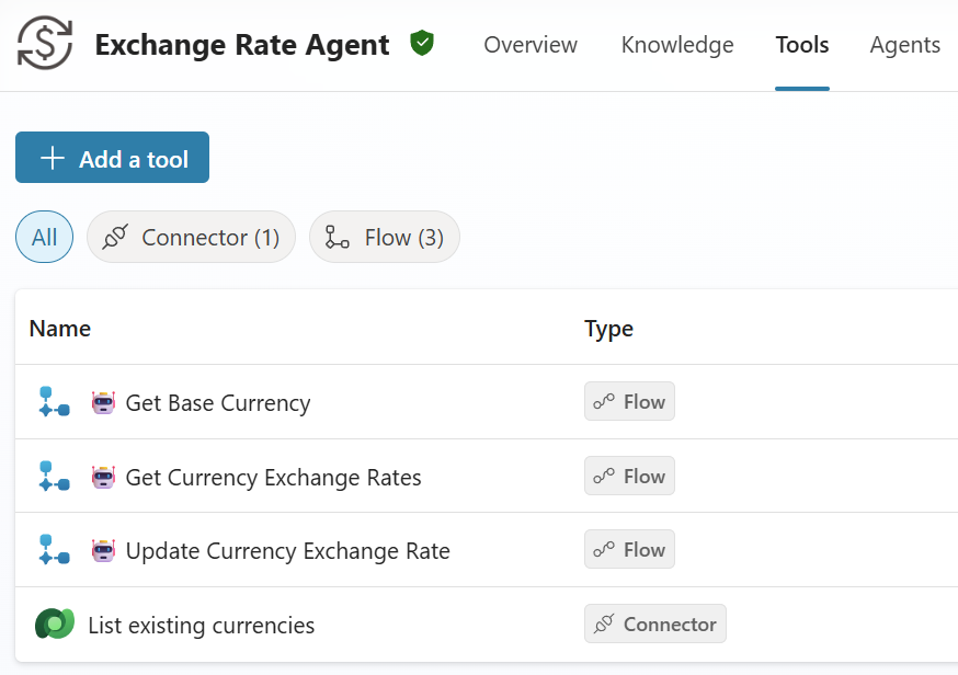 Next, I’m adding another Power Automate flow to my solution and as Tools to my agent. This is my flow 🤖 Get Base Currency. Here I will provide information about my system’s base currency to my agent. This makes my solution more generic. The result of this flow is per example: