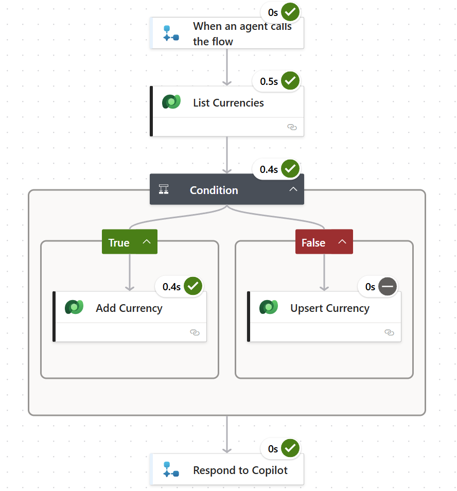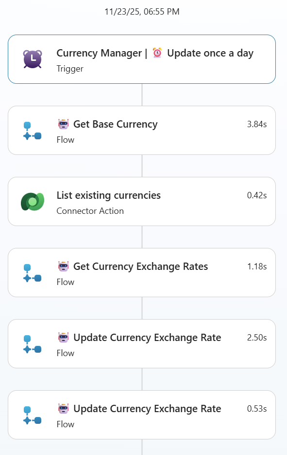 Secondly, I’m creating another flow to add or update the currency in my system. Here is an example of a successful run: