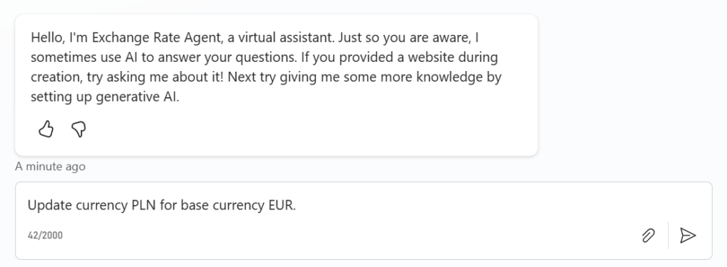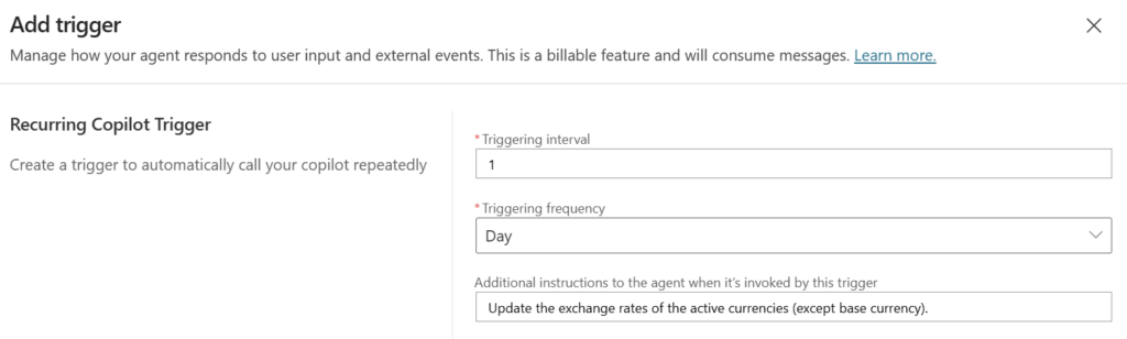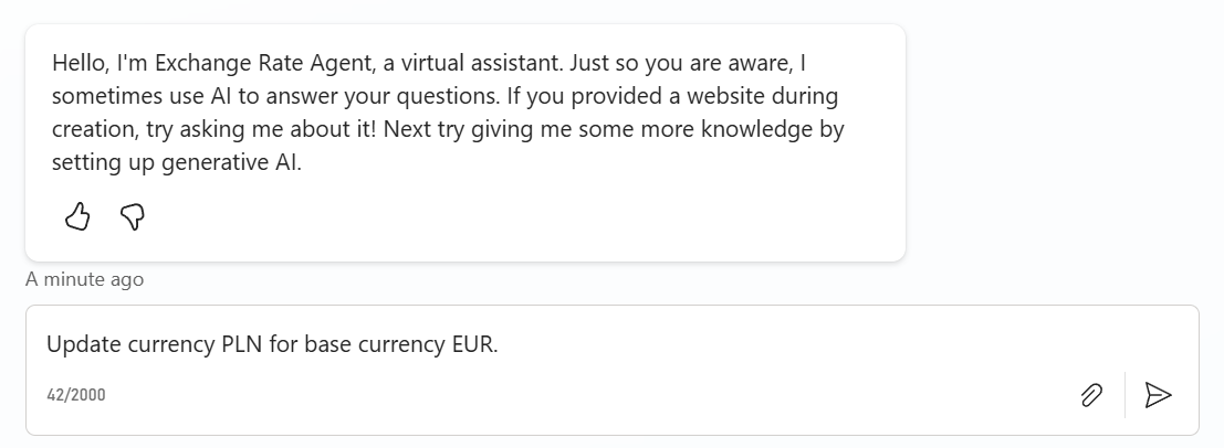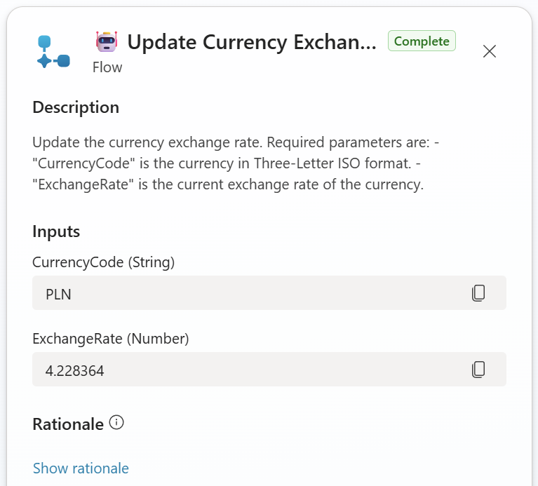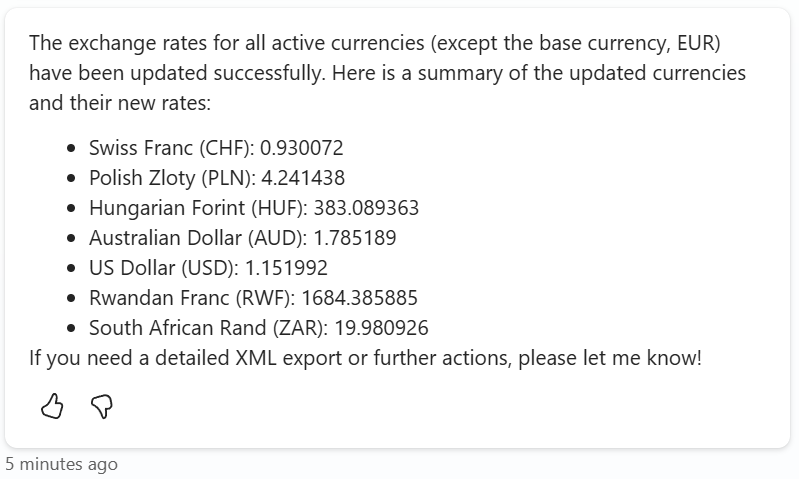 Why not automating this scenario within a Copilot Agent? My agent can keep my exchange rates in sync. Furthermore, it automatically can add new currencies when needed.