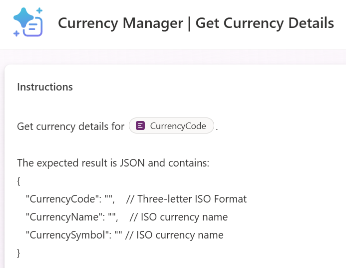 In addition, I’m using an AI Prompt to get the currency details such as currency name and symbol. This is because these fields are required when I’m adding a new currency to my system with Add Currency: