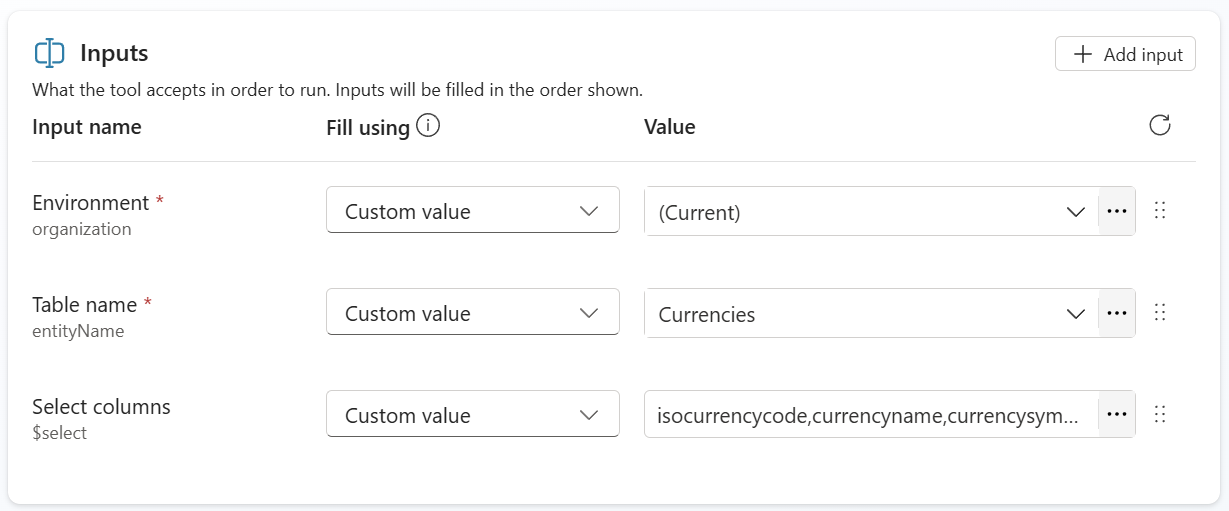 I’m using these input parameters for my new tool List existing currencies: