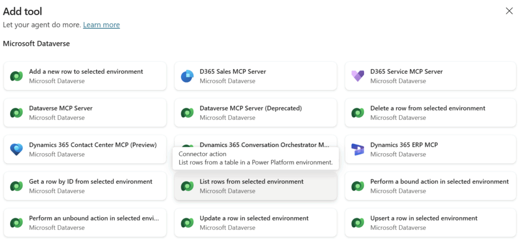 Afterwards, I’m adding another tool to my agent. Here I’m utilizing the Dataverse action List row from selected environment: